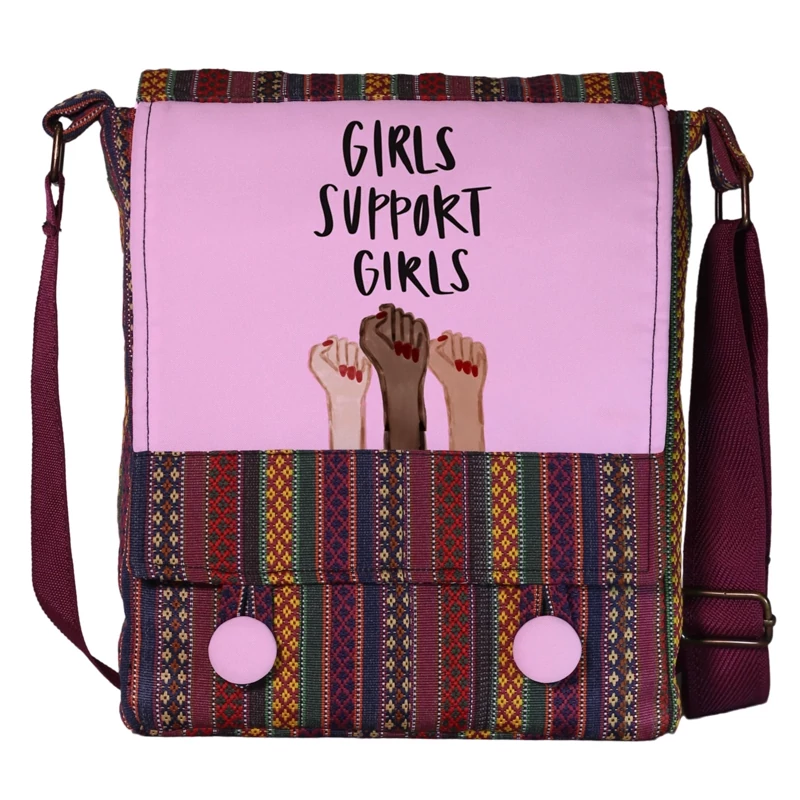 کیف دوشی چی چاپ طرح دخترانه Girls support girls با پارچه سنتی