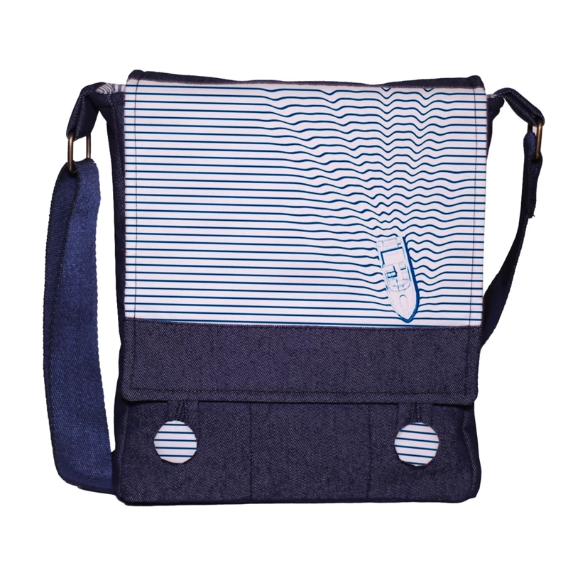 کیف دوشی چی چاپ طرح گرافیکی موج و قایق با پارچه جین آبی
