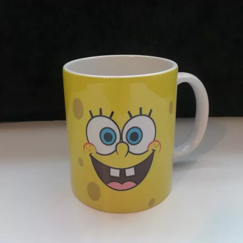 ماگ سرامیکی ،سفید رنگ، سایز 11 oz ،طرح باب اسفنجی همراه با زیر لیوانی ،قابل استفاده در ماکروویو، جهت ماندگاری بیشتر طرح، برای شستشوی داخل ماشین ظرفشویی قرار نداهید