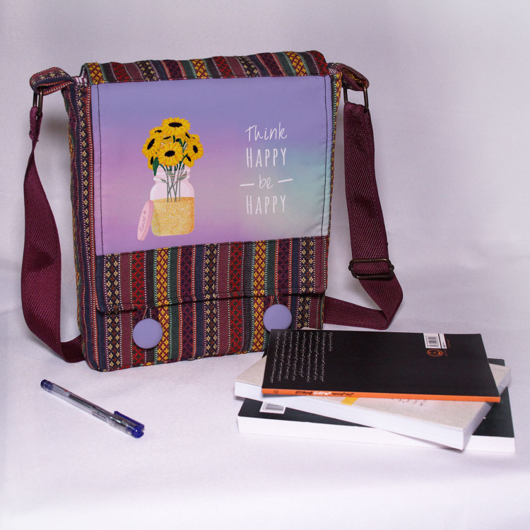 کیف دوشی چی چاپ طرح دخترانه گل آفتابگردان با پارچه سنتی کد be happy
