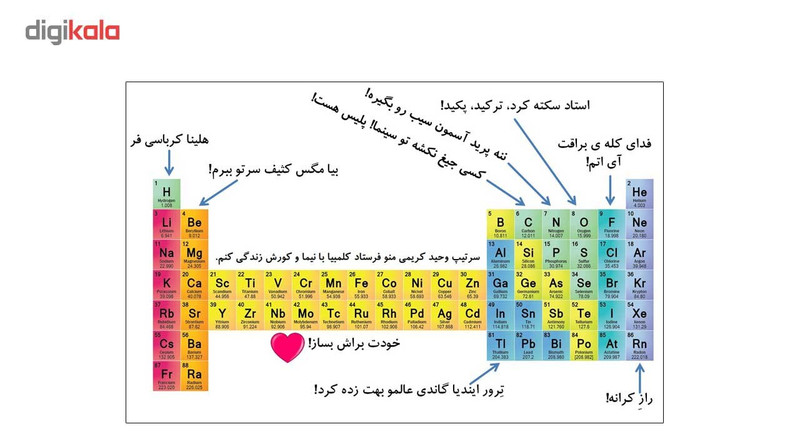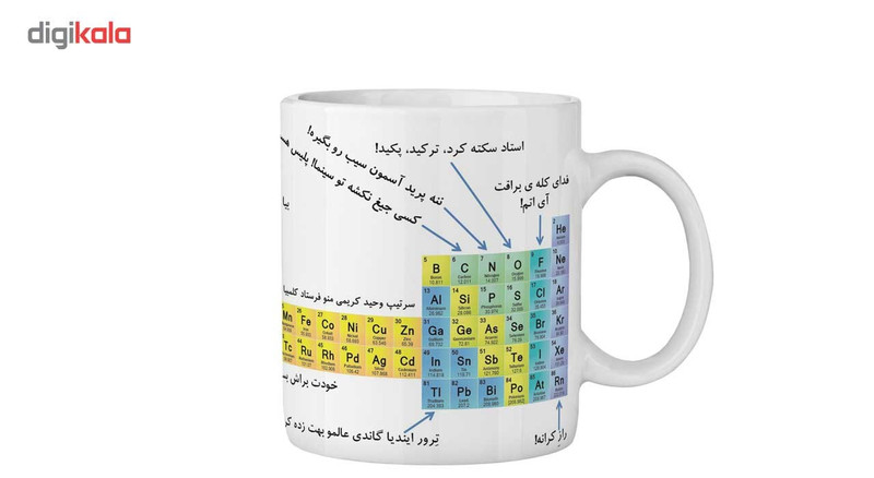 بر روی این ماگ, جدول مندلیف بصورت کامل چاپ شده است و برای استفاده دانش آموزان, کنکوری ها و دانشجویان و علاقمندان بسیار مناسب است. البته این مدل از جدول مندلیف, دارای جملات ساده آموز جهت حفظ راحت تره تمام جدول است.